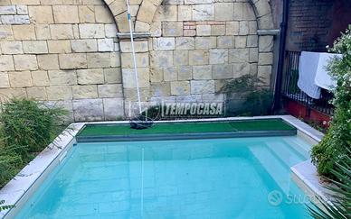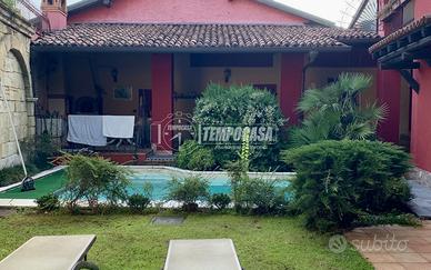 La proprietà si sviluppa su 2 livelli con una superficie totale di 500 mq, di cui 250 mq sono di giardino con PISCINA, portico e un altro GIARDINO con posti auto.