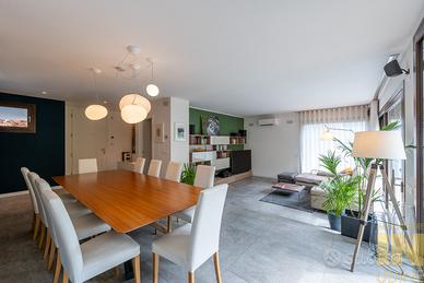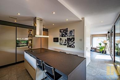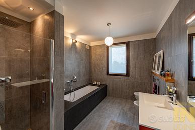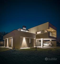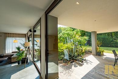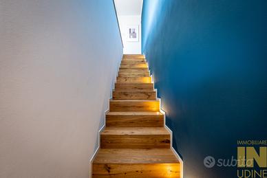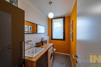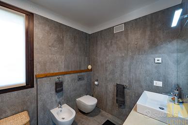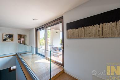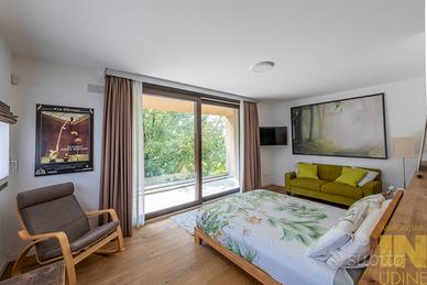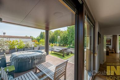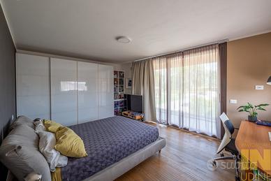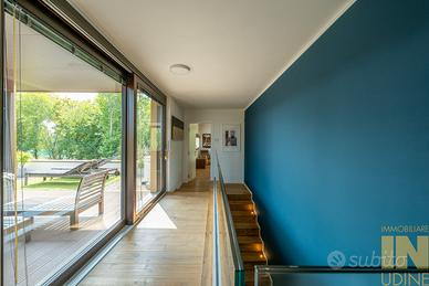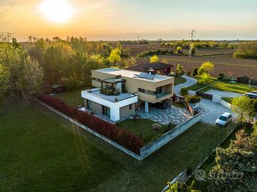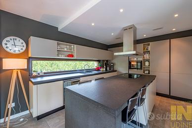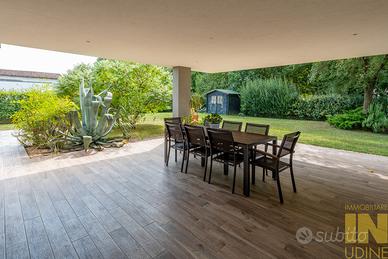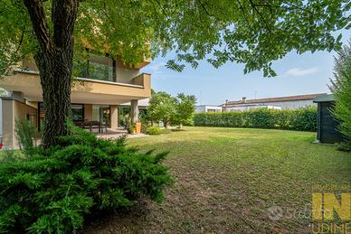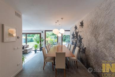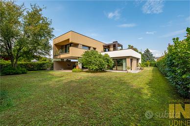 In posizione strategica tra Udine, Palmanova e Grado, meravigliosa villa indipendente dalle forme moderne e dal design ricercato. La casa, edificata nel 2015, è inserita in un contesto residenziale molto verde e tranquillo, si presenta in ottime condizioni di manutenzione e si sviluppa su due livelli per una superficie interna complessiva di mq. 250. Il piano terra è dominato da una generosa zona living con ampie vetrate affacciate sullo splendido giardino piantumato, che regalano viste, colori e luce meravigliosi in tutte le stagioni dell'anno. La cucina, di impronta moderna con ampia isola attrezzata, rimane separata dalla zona soggiorno ma a vista sulla stessa. Completano il piano terra un bagno ospiti/lavanderia, uno studio e la centrale termica. La zona notte, invece, si sviluppa al primo piano ed è composta da due camere matrimoniali, delle quali una padronale con bagno privato e cabina armadio: a questo livello troviamo una bella terrazza/solarium dotata di vasca idromassaggio. La villa, completamente circondata dal verde privato, dispone di un doppio posto auto coperto e di ulteriori posti auto all'interno della proprietà. Viene venduta completa di arredi, elettrodomestici, impianto di antifurto, impianto di climatizzazione e non necessita di nessun lavoro di manutenzione. Da un punto di vista energetico la villa risponde appieno agli standard costruttivi contemporanei ed i costi di gestione sono davvero molto contenuti: è certificata in classe "A4" ed il suo fabbisogno energetico è gestito in modalità totalmente elettrica (non c'è collegamento alla rete del gas), con impianto di riscaldamento a pavimento collegato alle pompe di calore ed all'impianto fotovoltaico di 6 Kw. Di primo livello anche le finiture d'interni, che uniscono qualità e design e rendono questa offerta immobiliare particolarmente accattivante, senza criticità e molto difficile da trovare attualmente sul mercato. Per ulteriori informazioni telefonare in sede.
