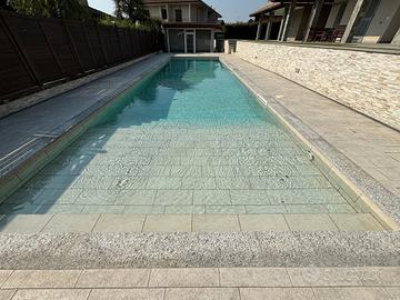 Vendo villa di nuova costruzione indipendente su quattro lati con terreno pertinenziale ad uso esclusivo di circa 400 mq, finiture di pregio, tre camere da letto, cucina, sala, soggiorno, tre bagni, lavanderia e locale caldaia, taverna con cucina, ampia autorimessa per due autovetture e due/tre motociclette o biciclette, pannelli fotovoltaici, presa in garage per ricarica auto elettriche, videocitofono. In uso comune con altre due ville adiacenti, c'è poi una piscina di 60 mq, un centro benessere (con sauna, bagno turco, vasca e doccia emozionale, zona relax con stufa a sale), ampia palestra con bagno e spogliatoio, cisterna di raccolta acqua piovana. Predisposizione per impianto d'allarme, ed impianto di videosorveglianza. Disponibile subito.