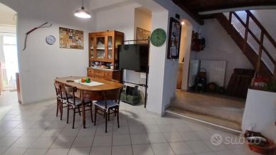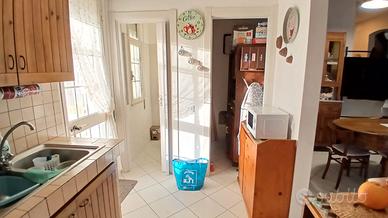 Nel soggiorno è presente un soppalco in legno aperto, di pregevole fattura, al quale si accede con una scala in legno che conduce al primo piamo dove troviamo una cameretta e un terrazzino