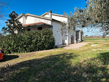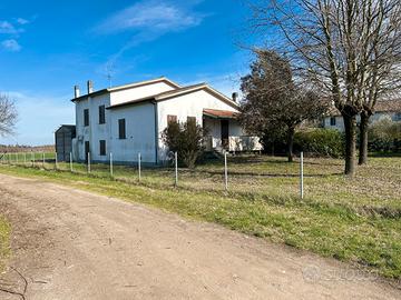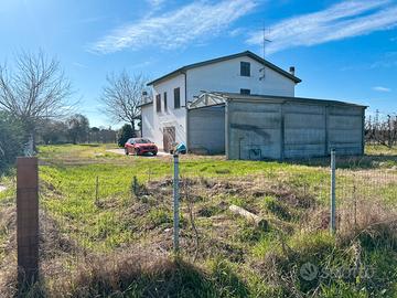 CASA INDIPENDENTE IN BUONO STATO CON GIARDINO ESCLUSIVO IN ZONA NON INTERESSATA DA ALLUVIONI. L'unità abitativa è sviluppata completamente al piano rialzato/primo (abitazione) e piano terra accatastato come servizi, oltre al fabbricato adiacente alla casa uso servizio agricolo privo di tetto (già smontato eternit e smaltito). Piano rialzato/primo: ingresso da gradevole e comodo terrazzo, soggiorno, cucina con sala da pranzo e camino, due bagni da ristrutturare (uno con il balconcino), quattro camere e scala interna di accesso al piano terra con tre vani uso ripostiglio/lavanderia, bagno e ampio garage di mq 53 con accesso anche dal piano terra. Mansarda grezza accessibile tramite scala rettrattile. Pavimenti in ceramica e granito. Impianti da verificare, infissi in legno con vetri camera. Disponibile da subito.