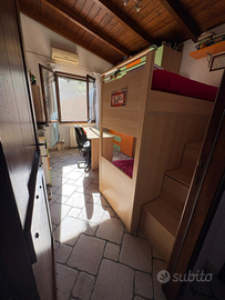 È composta da soggiorno cucina open space,due camere,disimpegno, ripostiglio e bagno con vasca e doccia, inoltre di un soppalco accessibile dalla camera.