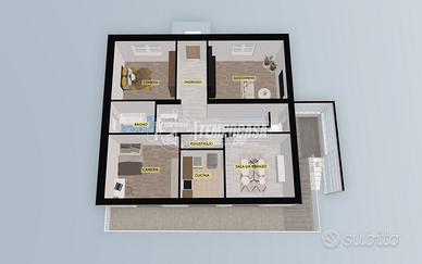 Una comoda scala interna ci accompagna al piano superiore, e ci accoglie un funzionale disimpegno che divide una seconda zona giorno composta da ampio soggiorno con la cucina a vista, e la zona notte che è composta da tre camere da letto, tutte ben distribuite e molto luminose. Completa il piano un pratico ripostiglio.