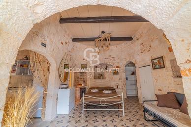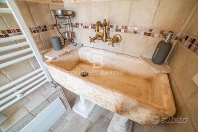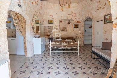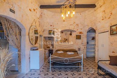 Limmobile si sviluppa attraverso tre corpi che dialogano armoniosamente tra loro: la parte anteriore in stile Liberty, luminosa ed elegante; la zona dei trulli, intima e suggestiva; e una cantina indipendente in pietra di circa 100 mq, situata in un seminterrato naturalmente luminoso e ben arieggiato grazie a cinque ampie finestre, uno spazio ideale per la realizzazione di una spa privata o di un esclusivo percorso benessere.