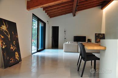 Gli ambienti, caratterizzati da un unico grande open-space a "travi a vista", si aprono sull'ampia vetrata nera in alluminio e triplo vetro, che regala luce a ogni ora del giorno e crea un dialogo perfetto con il giardino privato di oltre 500 m², ideale per pranzi all'aperto, cene sotto le stelle o eventi esclusivi in completa riservatezza.