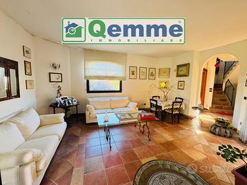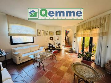 LEQUILE - In una zona residenziale tranquilla e ben servita, caratterizzata da spazio verde pubblico e da strade ampie con viabilità contenuta, proponiamo in vendita un'esclusiva villa moderna angolare che si distingue per eleganza, ampiezza e privacy. L'immobile si sviluppa su tre piani per un totale di circa 440 mq senza spese condominiali ed è circondato da uno splendido giardino piantumato con siepi alte che garantiscono massima riservatezza. Al piano rialzato troviamo un accogliente ingresso che conduce ad un soggiorno luminoso caratterizzato da grandi finestre e finiture raffinate, segue una cucina abitabile ideale per la vita familiare quotidiana, due bagni moderni, ripostiglio funzionale, camera da letto matrimoniale con cabina armadio e due camere da letto spaziose oltre a due ampie verande. Interessante e affascinate è il chiostro centrale a forma esagonale al piano terra, perfetto come area relax o verde privato al quale si accede dal soggiorno o dalla cucina. Il piano primo offre ulteriore comfort grazie al secondo soggiorno collegato tramite scala interna, due camere da letto aggiuntive, bagno disimpegnato e terrazzo a livello di circa mq 88 dove godere momenti all'aperto nella massima tranquillità. Al seminterrato al quale si accede dalla scala di comunicazione interna o direttamente dall'esterno, sono presenti: una cantina adibita a zona living, anch'essa con grandi vetrate che danno luminosità e ampiezza all'ambiente, una seconda cucina attrezzata, bagno, lavanderia, ripostiglio/dispensa, studio ideale per smart working, attività professionali o da utilizzare come ulteriore camera pluriuso ed un ampio garage con accesso diretto dallo scoperto ricavato dallo sbancamento del terreno che abbraccia gran parte del piano. La soluzione, ideale anche per due famiglie che vogliono condividere la stessa abitazione, è rifinita con pavimenti in simil cotto della ditta TAGINA ceramiche, infissi in PVC con doppio vetro e persiane, che sono stati sostitui