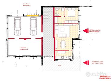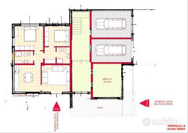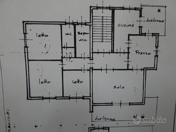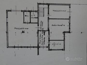 -piano terreno con altezza di 2,90 ml troviamo un ampio ingresso che porta alla scala di collegamento al piano primo, due locali utilizzati ad ufficio, magazzino lavanderia per complessivi 70 mq e magazzino di 80 mq circa, un bagno e un locale caldaia, il tutto trasformabile in secondo/terzo appartamento.