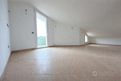 Il piano terra ospita l'ingresso principale dell'abitazione e si apre su uno spazioso disimpegno che conduce ai vari ambienti. Qui troviamo un ampio soggiorno con cucina open/space, una camera da letto e un bagno, oltre all'accesso diretto a una grande veranda coperta, perfettamente vivibile, con affaccio sul cortile e sul giardino di proprietà. Sul lato posteriore del piano è presente un cavedio che per metà circonda la casa. Dal piano terra, tramite vano scale interno, si accede al piano primo, dove si sviluppa un'ampia camera di rappresentanza, facilmente frazionabile per la realizzazione di ulteriori camere o ambienti funzionali, una camera matrimoniale e un bagno finestrato. A completare il livello, una grande terrazza perimetrale che circonda interamente il piano, valorizzando gli affacci sulla vallata ricca di querce e la vivibilità degli spazi esterni. Il secondo e ultimo livello è rappresentato dalla mansarda, con altezze che raggiungono i 2,70 m nel punto massimo e 0,50 m nel punto minimo. Il piano mansardato è composto da un'ampia camera, anch'essa divisibile, una camera da letto, un bagno finestrato e un balconcino esterno. A completare la proprietà vi è un terreno di circa 1.000 mq che circonda l'abitazione sul fronte strada, oltre a un ulteriore appezzamento di circa 2.600 mq raggiungibile tramite un piccolo sentiero, ideale come spazio verde, area relax o ulteriore pertinenza dell'immobile. All'interno dell'abitazione restano da completare alcuni interventi di finitura interna, come, le ringhiere della scala e dei terrazzi, la chiusura degli impianti e il loro collaudo. La parte più rilevante dei lavori residui riguarda gli spazi esterni con l'allaccio alla condotta idrica (con pozzo già presente), l'installazione di una nuova fossa biologica con collegamenti già predisposti all'esterno della casa, creazione di un cancello per l'accesso all'abitazione e infine un restiling generale al giardino.