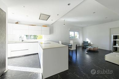 Lingresso conduce a un grande soggiorno open-space ricco di luce naturale, con cucina a vista dal design contemporaneo, isola centrale e uscita diretta sul giardino privato.