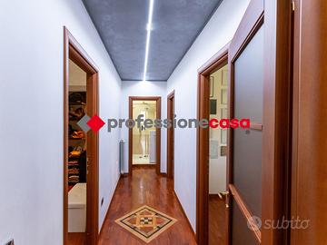 La zona notte, impreziosita da un parquet Doussié Africa, ospita una camera matrimoniale con cabina armadio, una cameretta, uno studio e due bagni con doccia.