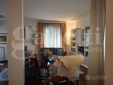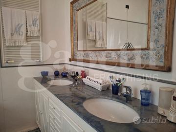 Attraverso una scala a chiocciola si accede al primo piano, dove si sviluppa un elegante salone con affaccio su terrazzo, collegato alla zona pranzo e a una cucina abitabile.La zona notte ospita una comoda camera da letto, una stanza adibita a cabina armadio, un bagno di servizio e un bagno padronale rifinito in pregiato marmo, dotato di vasca angolare con idromassaggio.