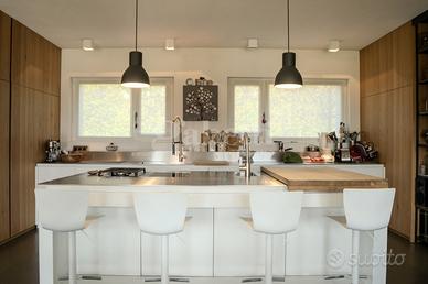 BL-24 Proponiamo in vendita una splendida villa moderna ed elegante, situata in posizione strategica a pochi passi dal centro cittadino, immersa in un contesto riservato e circondata da oltre 7.000 mq di terreno privato che garantiscono tranquillità e privacy assoluta. La proprietà si sviluppa su tre livelli armoniosamente distribuiti. Al piano terra si apre una luminosa e raffinata zona giorno, completamente affacciata sul grande giardino, dove gli spazi sono pensati per essere vissuti: una cucina moderna, un ampio tavolo da pranzo e un accogliente soggiorno impreziosito da un elegante camino di design. Un raffinato corridoio conduce poi a uno studio, anch'esso con camino, a una spaziosa sala hobby e a un bagno con doccia. Salendo al piano superiore, si viene accolti da un piacevole salottino che introduce alla zona notte. Qui troviamo la camera padronale, un ambiente esclusivo dotato di bagno en suite con doccia e vasca. Il piano ospita due ulteriori camere matrimoniali, una cabina armadio e un secondo bagno, anch'esso servito sia da doccia che da vasca, a garanzia di massimo comfort. Il piano seminterrato è dedicato al benessere e alla funzionalità: una vera e propria area wellness con palestra attrezzata, sauna, doccia e zona relax, ideale per rigenerarsi in totale privacy. A questo livello si aggiungono una stanza multifunzionale, una comoda lavanderia, un bagno con doccia e due camere matrimoniali, perfette per ospiti o personale di servizio. Completa la proprietà un garage di generose dimensioni, in grado di ospitare più veicoli. Una soluzione abitativa unica, in una posizione privilegiata, ideale per chi desidera vivere nel comfort senza rinunciare alla vicinanza ai principali servizi