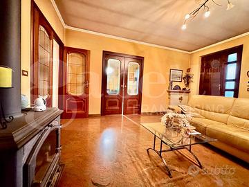 Al piano terreno (c.a 100 mq) troviamo una sala living, ampia cucina abitabile dotata di canna fumaria e con uscita su portico coperto, disimpegno, due camere e doppi servizi.