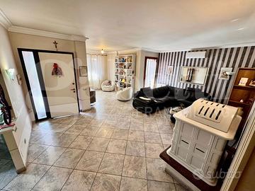 Via Torino, comodissima alla provinciale ed al centro paese, proponiamo ampia villa unifamiliare disposta su unico livello oltre sottotetto ed interrato e circondata da ampio giardino, portico e terrazzo. P.T: soggiorno living con zona pranzo, cucina abitabile con affaccio su portico coperto, disimpegno, due camere e servizio; P.M: open space con camera, studio e servizio; P.I.: taverna, cucina, due cantine, locale sgombero, centrale termica, lavanderia, 2 ripostigli e box doppio. L'immobile si presenta in ottime condizioni e con svariati interventi di ristrutturazione nel corso degli anni che lo rende subito abitabile e senza interventi urgenti ed invasivi da eseguire nell'immediato. Pannelli fotovoltaici 6kw con accumulo di 10Kw. - serramenti doppi vetri in PVC in tinta legno sostituiti sia al piano terra che al piano mansardato - antifurto -condizionatori - zanzariere - inferriate - facciata esterna rifatta a Settembre 2025. DA VEDERE