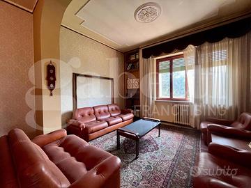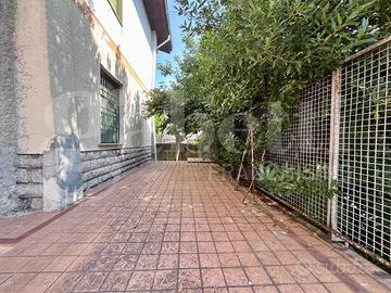 Attualmente la soluzione, di generosa metratura, si compone di due diversi appartamenti, utilizzabili da due distinti nuclei familiari; al piano rialzato troviamo il primo appartamento, con ingresso in corridoio che conduce al doppio salone con zona pranzo, la quale gode di accesso ad un'ampia terrazza. Troviamo poi una cucina abitabile, un bagno finestrato completo di doccia e di vasca, e due camere da letto matrimoniali.