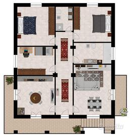 L'immobile è disposto su due livelli e sviluppa una superficie di circa 250 mq, ed è così composto: al piano terra troviamo la tavernetta, due camere, locale caldaia e cantina; al primo piano ingresso, cucina con uscita sul balcone, soggiorno, quattro camere ed un bagno finestrato con vasca. I due piani sono collegati sia da scala interna che esterna.