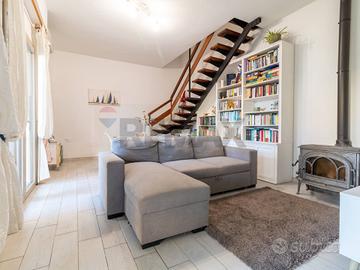 Al piano terra troviamo un ampio salone con cucinotto, tramite una scala si accede alla zona notte NON MANSARDATA composta di due ampie camere da letto, un bagno finestrato con doccia e balcone accessibile da entrambe le camere.