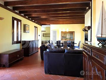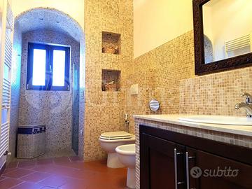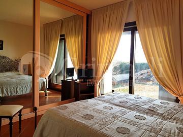 Proponiamo in vendita maestosa villa fronte strada su strada provinciale Gallipoli - Alezio, libera su quattro lati e attorniata da ampi spazi esterni. La soluzione proposta, di recente costruzione, è rifinita con materiali di pregio, provvista di ogni comfort e ottimamente tenuta, sia negli spazi interni che in quelli esterni. Il piano rialzato della villa si sviluppa su una superficie interna di circa 215 mq, gli ambienti sono armoniosamente disposti, ricchi di diverse finestre e porte finestre che rendono ogni vano luminoso; si compone di: ingresso in ampio soggiorno con termo camino, sala da pranzo con cucina in muratura e vano lavanderia, tre camere da letto, di cui due con ingresso indipendente e asservite da bagno, vano cabina armadio e bagni rifiniti con mosaico in travertino. Due terrazzi a livello antistanti e un terrazzo accessoriato a servizio della zona cucina, circondano l'abitazione. I dettagli di rifinitura danno alla villa un tocco magico: due graziose nicchie decorate con affreschi dipinti a mano, il disimpegno con volta a botte, anche questo con suggestivo affresco e le abat-jour a muro, in caratteristiche nicchie ricavate nella muratura e anche queste dipinte a mano. La pavimentazione in cotto insieme alle travi in legno e alle porte in legno Rovere regalano un'atmosfera calda ed accogliente. Al piano seminterrato invece, su una superfice di circa 170 mq sussiste una taverna finestrata, predisposta come ampio loft in cui insiste una cucina in muratura ed un servizio. Questa, gode di impianti elettrici e di riscaldamento autonomi rispetto al piano principale della villa. Sempre al piano seminterrato ampio garage. Fiore all'occhiello di questa incantevole proprietà sono gli spazi esterni, infatti, un ampio giardino ed un frutteto completano la villa per una superficie complessiva pari a circa 5.000 mq. L'irrigazione del lotto avviene attraverso due pozzi di acqua sorgiva, insiste anche un pozzo artesiano in pietra autorizzato. Parti