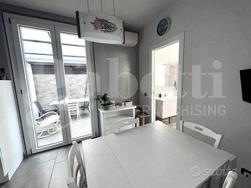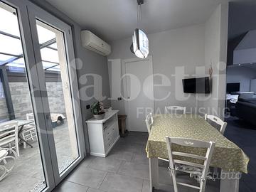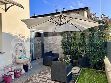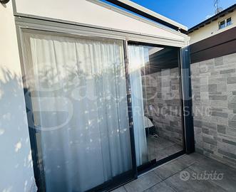La veranda con tenda da sole motorizzata offre un'area ideale per pranzi all'aperto e momenti di relax.