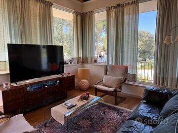 Al piano rialzato si accede da un ampio ingresso. La zona giorno è caratterizzata da una serra climatizzata in cui è stato ricavato un elegante salone doppio panoramico con camino. La cucina è abitabile. Completano il livello tre camere da letto, due bagni, un ripostiglio e una veranda coperta, per un totale di 230 mq più 60 mq di verande attrezzate.