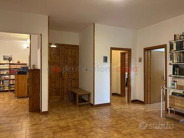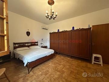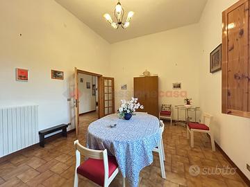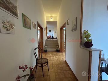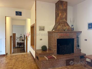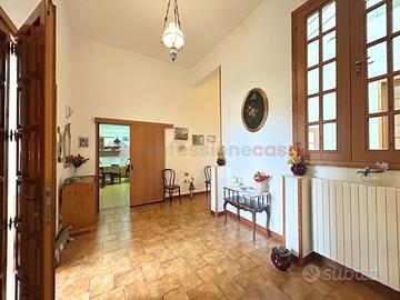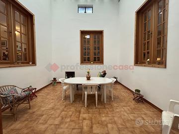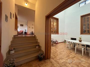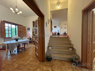 Il viale, pavimentato con caratteristiche chianche, conduce all'ingresso principale della villa, che si apre su un ampio disimpegno. L'abitazione si sviluppa attorno a una chiostrina centrale, che garantisce luce e ariosità agli ambienti interni. La zona giorno comprende un elegante salone, una spaziosa area living con camino e una cucina abitabile, corredata da ripostiglio, lavanderia con wc e vano caldaia esterno, accessibile anche da un ingresso di servizio.