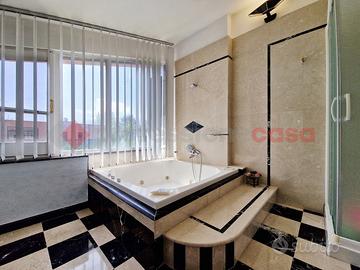 Una prestigiosa scala a chiocciola ci conduce al primo piano dove troviamo tre camere da letto matrimoniali ed un'ampia e raffinata sala da bagno con vasca idromassaggio, doccia e doppio lavandino.