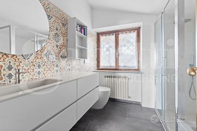 Al piano terra, un elegante ingresso con ampie vetrate affacciate sul verde introduce a una zona giorno ampia e luminosa, dove il doppio salone con camino e la sala da pranzo convivono in un'atmosfera raffinata.