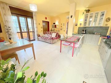 * Piano Rialzato di 98 mq: ampio living con cucina a vista, affacciato su una balconata con vista sul giardino. Dal disimpegno, due camere da letto, due bagni e un versatile locale dispensa/guardaroba.
