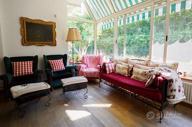 Entrando ci accoglie il salone angolare, con un elegante camino centrale intorno al quale si distribuiscono gli spazi di rappresentanza con porte e affacci sul verde rigoglioso del giardino. La bella zona pranzo, anch'essa affacciata sul verde, è annessa all'accogliente cucina. Dalla cucina e dalla zona pranzo accediamo alla zona del giardino attrezzata con una ulteriore zona pranzo esterna, e con una zona relax. Al medesimo piano, ben disimpegnati, una camera con accesso indipendente dal giardino ed il bagno. Il primo piano accoglie la zona notte con 3 camere da letto: la camera padronale con la cabina armadio, il bagno proprio ed il terrazzino; le altre 2 camere anch'esse con bagno. Nel piano seminterrato si trova un grande ambiente vivibile, con accesso indipendente dal giardino, luminoso grazie alle grandi finestre ed un bagno, oltre la grande lavanderia ed i vani tecnici. Il giardino, con il prato all'inglese ed il susseguirsi di siepi, cespugli, piante da fiore, alberi ed arbusti, riveste un ruolo da protagonista. villa