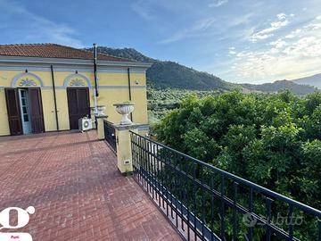 L'ingresso nell'atrio decorato in stile classico e una pregiata scala in marmo ci conducono al piano primo composto da cucina, bagno, due camere da letto e salotto e affacciato su una terrazza panoramicissima.