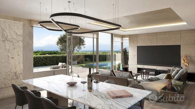 La villa accoglie con eleganza in un luminoso living open space, dove ampie vetrate panoramiche si aprono verso il giardino e il Lago di Garda, un'area con cucina a vista è predisposta per accogliere una soluzione personalizzata secondo le proprie esigenze.