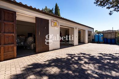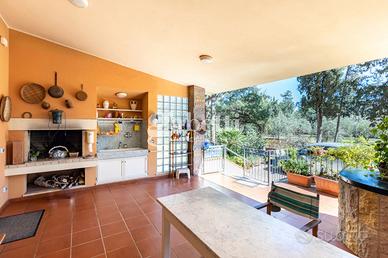 La proprietà è circondata dal giardino di circa un ettaro in cui sono presenti alberi e vegetazione di vario tipo ed un curato uliveto; l'immobile ha due ingressi carrabili da due strade parallele ed un ingresso pedonale.