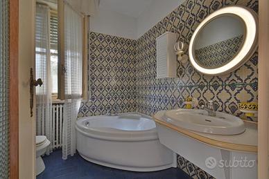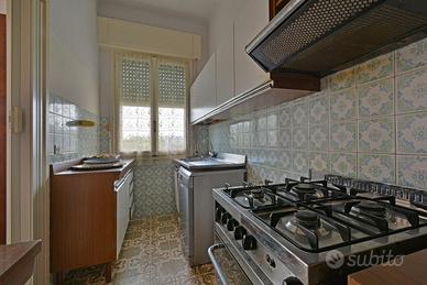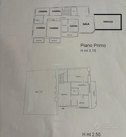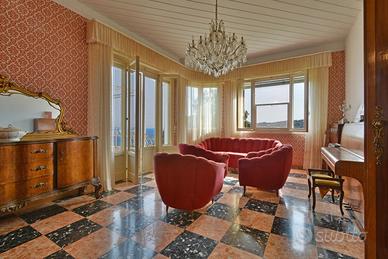 Piano primo: salone con soggiorno che dà accesso alla grande terrazza di 70mq vista mare, ampia cucina e tinello con balcone, quattro camere da letto di cui due con balcone vista mare, un bagno e infine un ripostiglio. Il riscaldamento è autonomo con caldaia (termosifoni).