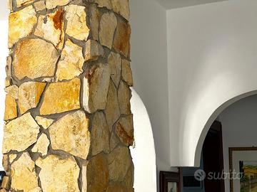 * La zona giorno, con i suoi rivestimenti in pietra e la luminosità naturale, crea un'atmosfera