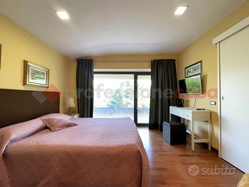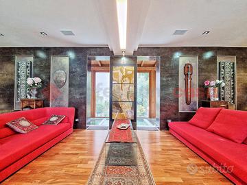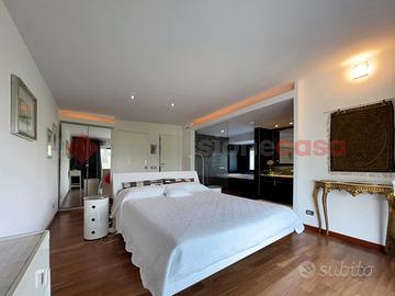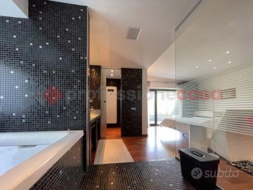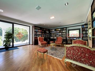 Sempre sullo stesso piano si trovano un primo bagno di servizio e una suggestiva biblioteca con ulteriore bagno privato, ideale come studio, sala lettura o spazio di rappresentanza.
