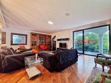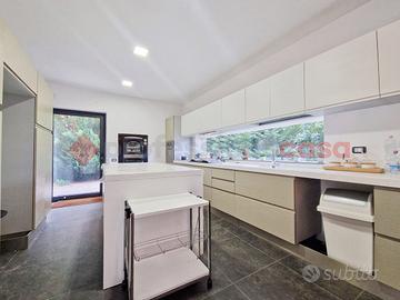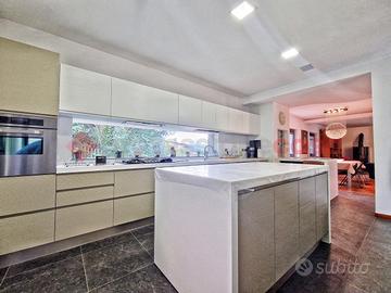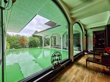 Da qui si accede alla zona giorno composta da un arioso salone triplo con parquet e affaccio diretto sulla piscina - grazie alle grandi vetrate che valorizzano la luce naturale e l'integrazione tra interni ed esterni - e, adiacente, un'ampia cucina abitabile con isola.