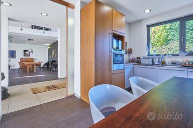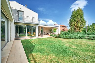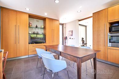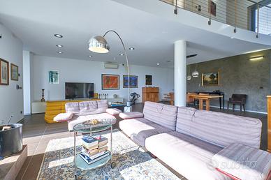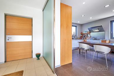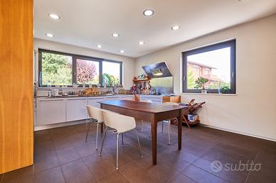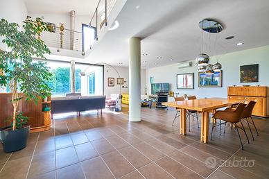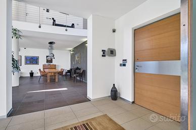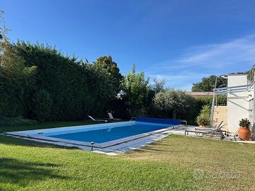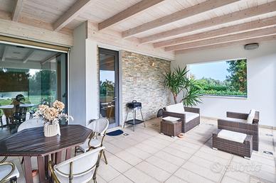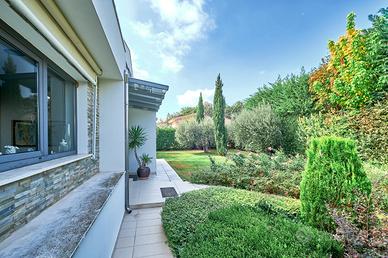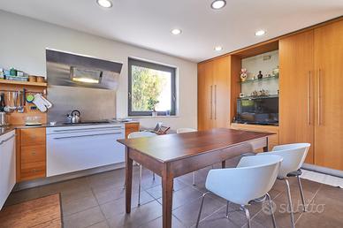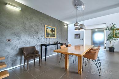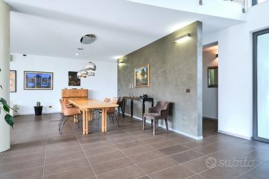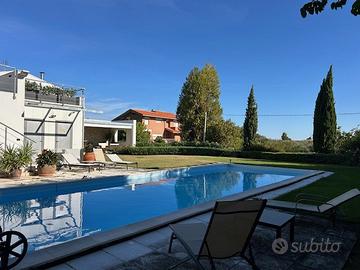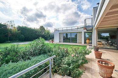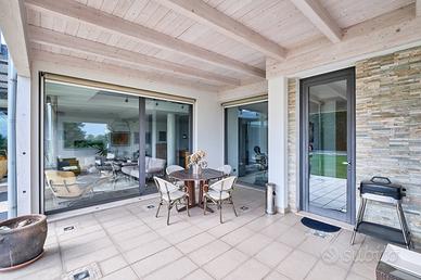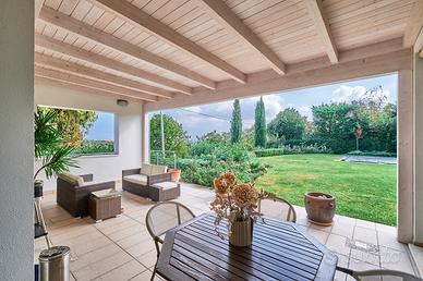 in posizione panoramica con splendida vista mare e monti. La villa, concepita con design architettonico moderno, originale e funzionale, si presenta elegante e accogliente, perfetta per chi cerca ampi spazi, privacy e finiture di alto pregio sia internamente che esternamente. La proprietà si sviluppa su 2 livelli fuori terra e uno seminterrato. Il piano terra è composto da spaziosa cucina abitabile con accesso diretto al portico, impreziosito da una copertura in legno di alta qualità, ampio e luminoso salone a doppia altezza dove si distingue la zona pranzo dal salotto con camino, illuminato da grandi vetrate vista giardino. Completano il piano un'accogliente libreria/studio, una camera matrimoniale, una cameretta e doppi servizi. Al piano superiore si accede da una comoda scala interna dalle rifiniture resistenti ed eleganti, con affaccio open-space sul salone, in cui troviamo la camera padronale completa di ampia cabina armadio, terrazzo con vista sulla piscina e bagno privato dotato di vasca idromassaggio. Al piano seminterrato troviamo una accogliente e conviviale taverna con cucina, accessibile sia dalla scala interna che dall'esterno. Sullo stesso livello sono presenti, inoltre, bagno, funzionale cantina, zona lavanderia e ampio locale multiuso. Completa il piano un grande garage di c.a. 57 mq. A conferire valore aggiunto all'abitazione, oltre alle pregiate finiture interne, è certamente l' ampio e curato giardino completamente recintato che avvolge la villa e che ospita, oltre ad una varietà di piante ornamentali, una splendida piscina di 14x5 mq arricchita da un area lounge all'aperto perfetta come zona barbecue. L'abitazione è dotata di solare termico, impianto di riscaldamento a pavimento con pompa di calore, impianto fotovoltaico doppio, domotico