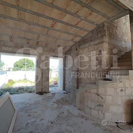 La villa è ubicata nella zona residenziale posta in prossimità dell'area urbana ad espansione periferica conosciuta come 'Nuova Ugento', e sviluppa una superficie coperta di Mq 330,00 distribuiti su tre livelli. Al Piano Seminterrato troviamo un'ampia autorimessa ed una comoda tavernetta composta da due vani e servizio igienico. Tale tavernetta ha ingresso indipendente dalla rampa d'accesso, mentre l'autorimessa è in diretta comunicazione col giardino retrostante. Una comoda scala dalla forma elicoidale conduce al Piano Rialzato, dove troviamo la Zona Living con area cucina, bagno, e due camere da letto, della quale la matrimoniale è dotata di una comoda e spaziosa cabina armadio. La copertura della Zona Living ha una particolare forma ondulata con mattoni in pietra a vista. Al Piano Primo troviamo un altro vano, che può essere utilizzato come terza camera da letto, ed un bagno. Un grazioso terrazzo a livello di quasi 50,00 Mq completa il Piano, dove è prevista la realizzazione di un pergolato, che consentirà di avere in futuro un'esclusiva area relax.