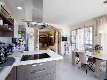 Accedendo dal patio con pergolato in legno, si entra in un grande open space luminoso e arioso, perfetto per accogliere e vivere la zona giorno con stile.