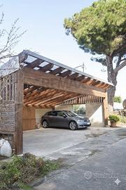Un ampio spazio coperto con una rifinita tettoia in legno offre una zona parcheggio tutelata e semicoperta.