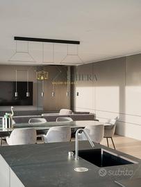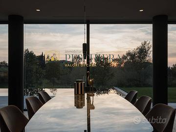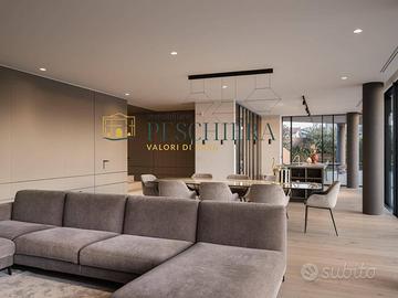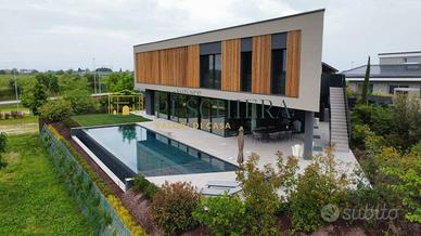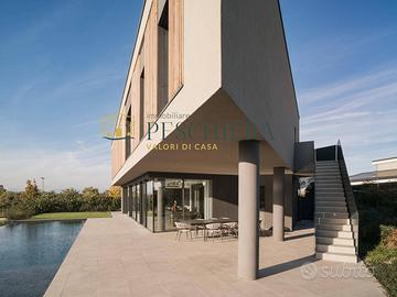 Lingresso conduce a una zona giorno open space, impreziosita da eleganti boiserie che conferiscono calore e raffinatezza agli ambienti. Lo spazio è caratterizzato da ampie vetrate che regalano luminosità naturale e si affacciano sulla piscina privata a sfioro di 15 metri e su un elegante loggiato di 200 mq, ideale per vivere momenti di relax e convivialità allaperto. Sullo stesso livello si trovano uno studio riservato, un bagno finestrato e un ampio garage collegato direttamente allabitazione, comodo e funzionale per garantire praticità quotidiana.