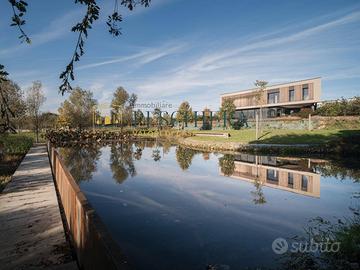 La proprietà, circondata dal verde e situata a pochi passi da un suggestivo laghetto naturale, si estende su un lotto di circa 1.000 mq e si distingue per il suo stile contemporaneo, le finiture di design e la perfetta armonia tra spazi interni ed esterni.