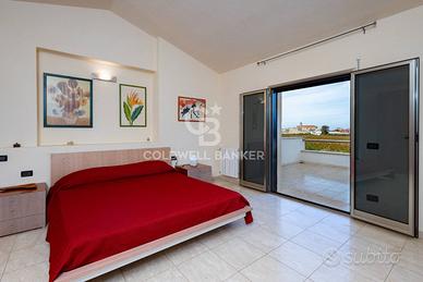 Al primo piano, una spaziosa zona living con terrazzo panoramico, suite padronale con bagno privato e vista sulla piscina.