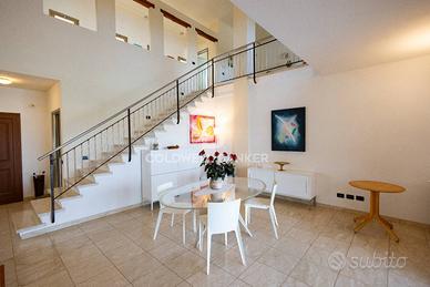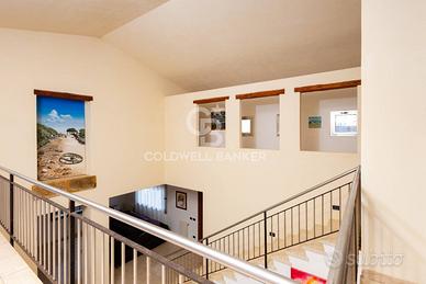 Disposta su due livelli, la villa offre al piano terra un ampio doppio soggiorno con soffitti fino a 6,5 m, cucina abitabile con accesso diretto al giardino, due verande (una sulla piscina), zona notte con due camere e due bagni.