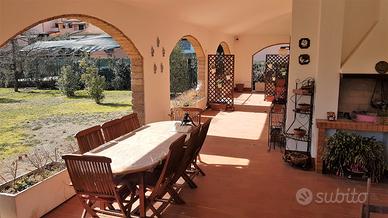 VENDITA DIRETTA - NO AGENZIA O INTERMEDIARI Splendida villa unifamiliare di 630 mq, su tre livelli, composta da: 1.PIANO TERRA da 230 mq: ingresso, salone con camino, cucina abitabile e tinello con camino e terrazzo, disimpegno, tre camere, studio, cameretta, tre bagni con vasca e doccia oltre ad un ampio portico con barbecue; 2.PIANO SEMINTERRATO di 300 mq (con intercapedine tutto intorno larga più di 1 metro e adatta per deposito di materiali vari e della legna): taverna con camino, cucina e tinello con forno a legna, sala hobby, lavanderia, bagno con doccia e grande garage; 3.PIANO PRIMO: appartamento con ingresso INDIPENDENTE di 100 mq con terrazzo di 60 mq, composto da ingresso, soggiorno con camino ed ampio angolo cottura, camera, cameretta e bagno con vasca. Completa la proprietà un parco di 1400 mq con alberi ad alto fusto. Inoltre c'è ancora della edificabilità fino a 1300 metri cubi. Riscaldamento autonomo. Ottime rifiniture: cotto Impruneta ai pavimenti, infissi in legno con doppi vetri, cisterna interrata di 50 metri cubi per la raccolta dell' acqua piovana con impianto di irrigazione completo, cancello automatico. La villa, data la metratura, si presta per una RSA, B&B, o per diversi nuclei della stessa famiglia. ASTENERSI AGENZIE