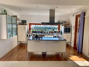 Le ampie vetrate esposte a sud di un soggiorno particolarmente spazioso e della cucina, si affacciano su uno splendido giardino di circa 700 mq, perfettamente mantenuto; completa il piano terra l'area servizi con bagno, lavanderia e garage.