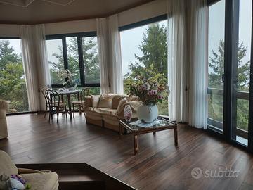 Situata tra le incantevoli colline dell'entroterra romagnolo, questa villa signorile con il particolarissimo corpo fabbrica principale a pianta ottagonale che si inserisce nella parte rimanente dell''edificio rappresenta un'opportunità unica per chi cerca una residenza di prestigio a pochi chilometri da Rimini. Immersa in un contesto di grande fascino storico e naturale, la proprietà offre una vista panoramica mozzafiato sulla Riviera Adriatica e sulle montagne circostanti, rendendola la meta ideale per chi desidera tranquillità e bellezze paesaggistiche. La villa, costruita nel 1979 ed in ottima condizioni di conservazione, si sviluppa su una generosa metratura di 494 m² commerciali e 353 m² lordi. Libera su quattro lati, è circondata da un ampio giardino pertinenziale di circa 6.800 metri, oltre ad altri terreni adiacenti di proprietà per circa 19.000 metri con piante secolari, alberi da frutto e una varietà di vegetazione, il tutto servito da un pozzo privato, che creano un'atmosfera serena e rigenerante. Al piano terra, troviamo una tavernetta da 60 mq, un'altra tavernetta da 34 mq, due cantine, una lavanderia, un ripostiglio ed i locali tecnici. Al piano primo, un luminoso soggiorno ottagonale di ampia superfice e con ampie vetrate offre una vista spettacolare sul paesaggio circostante. La villa dispone di un tinello accogliente e di una cucina funzionale, una camera matrimoniale con bagno privato e due ulteriori camere da letto servite da un bagno principale. Al piano soppalcato un'ulteriore stanza di circa 25 mq finestrata. Compreso nel prezzo quasi tutto l'arredo con alcune esclusioni da comunicarsi in sede di visita. Con dimensioni generose e una posizione invidiabile, questa villa è un'opportunità imperdibile per chi sogna una vita immersa nella natura senza rinunciare al comfort e alla comodità