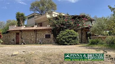 SAN TEODORO - a soli 1,8 km dalla spiaggia La Cinta Villa con vista mare e parco, da rimodernare e possibilità di piscina, in vendita a San Teodoro, Olbia. In posizione collinare nella campagna alle spalle di San Teodoro, un luogo immerso nella natura con una vista scenografica sul mare, con le spiagge più belle della costa, come Lu Impostu e Cala Brandinchi, a soli 10 minuti. La villa è stata disegnata negli anni '60 a forma irregolare su più livelli, pietra grezza e calce bianca nelle facciate, con grandi terrazze, portici, verande e pergolati che si affacciano su un panorama mozzafiato sulla spiaggia de La Cinta e del paese di San Teodoro, un armonia di spazi per vivere all'aperto tutto l'anno. Gli interni sono caratterizzati da un salotto con camino centrale, free-standing, con base in pietra e aperto su una grandissima terrazza sul mare, e da scale interne rivestite in legno che collegano i vari livelli: una scala ovoidale conduce ad una mansarda aperta sul soggiorno con uno studio, zona lettura e accesso ad una deliziosa terrazza sul tetto con una vista difficile da descrivere, una camera e un bagno. Sempre dal soggiorno al piano terra, una larga scala in parquet conduce ad una zona dedicata ad una spaziosa camera matrimoniale con bagno, e una suite con soggiorno e camera matrimoniale, terrazza e bagno. La zona pranzo al piano terra apre su una tipica cucina gallurese e una veranda con zona pranzo all'aperto. Con ingresso separato da una veranda esterna, un soggiorno con cucina e una camera matrimoniale con bagno sono dedicati agli ospiti.