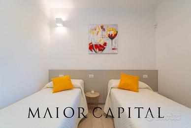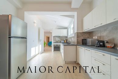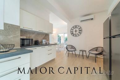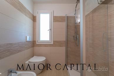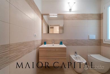 Gli spazi interni, luminosi e armoniosi, si distinguono per un soggiorno moderno e accogliente, con dettagli cromatici che aggiungono calore. La cucina lineare e funzionale si apre sulla sala da pranzo, caratterizzata da ampie vetrate panoramiche che collegano interno ed esterno, esaltando la luce naturale.