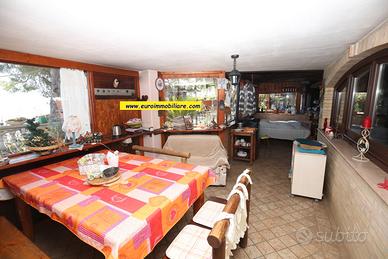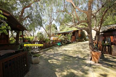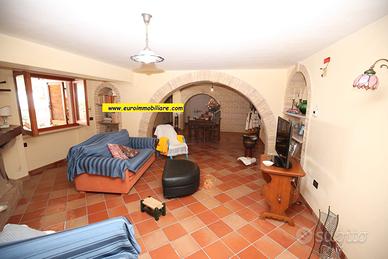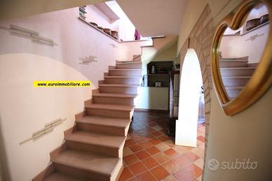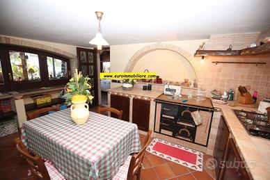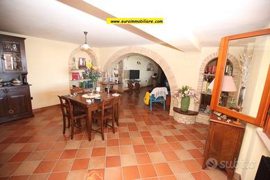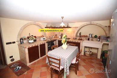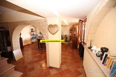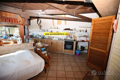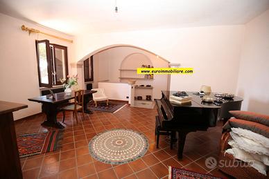 Varcando il grande atrio esterno al piano terra si accede ad una spaziosa veranda in legno, chiusa e finestrata, dotata di cucina che unisce l'atmosfera accogliente degli ambienti interni al comfort degli spazi aperti. Il piano terra composto anche da un grande e doppio salone, una cucina, un bagno finestrato con doccia. Gli ambienti sono armoniosamente divisi da archi in mattoni vivi, mentre le porte, decorate con elementi in vetro colorato, aggiungono un tocco di originalità e stile.